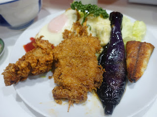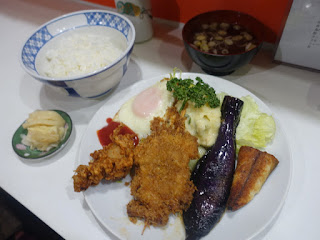 目玉焼き、ポテトサラダ、から揚げ、串カツ、茄子、サバ塩焼き。