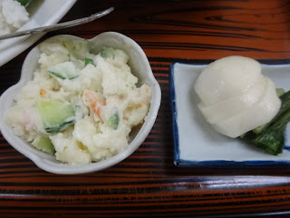 出てきたのはこんなんです。ポテトサラダやお新香もついてます。