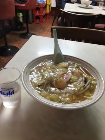 あんの中にいかやえび、キャベツ、もやしなどが入ったラーメンです。