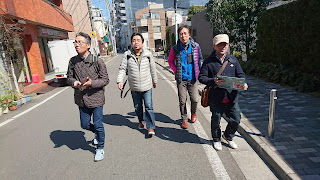 庚申通り商店会を行く。本橋さん「かつてはこの通りがメインストリートだったんでしょう」とおっしゃる。