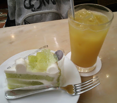 マグロ隊員が入ったという「コージーコーナー」へ向かう。「日替わりケーキセット」(740円)を注文。この日のケーキは「メロンショートケーキ」。メニューを見ると、通常なら「810円」だそうだ。よっし、70円得した!