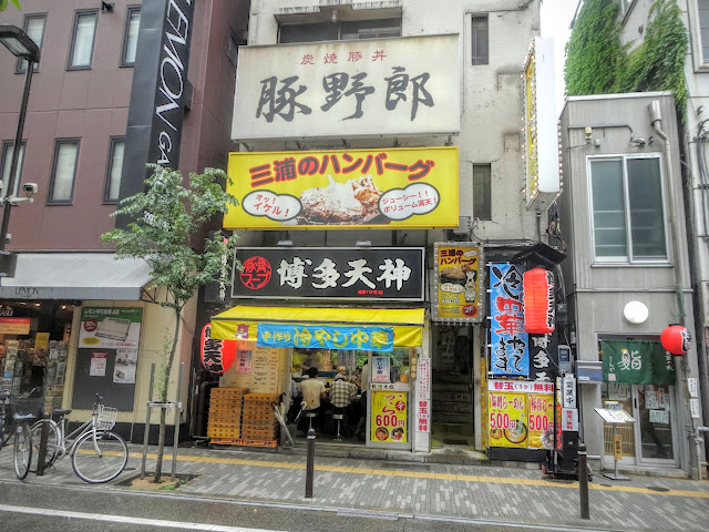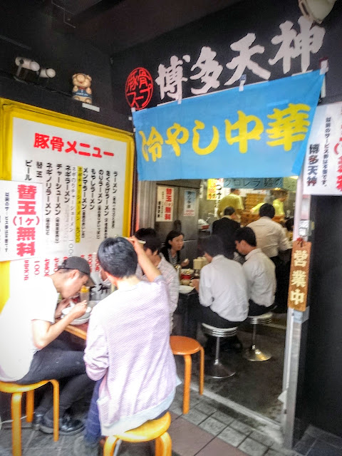 半澤くんは、悩みながらもここ『こうや麺房』にするそうだ。竜さんも逡巡してたが、「あそこの席があいているよ」と指さす。おお、ならばと見るも、二人掛けだ。ならばここは二人に譲り、僕は『博多天神』へでも行ってみようか。実は6/7にこちらの博多天神へ冷やし中華を食べに行ったのだが、まだ冷し中華は始まっていなかった。