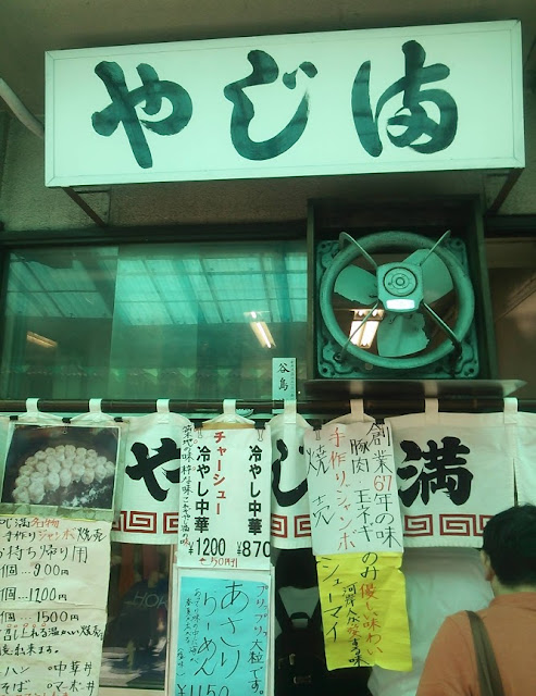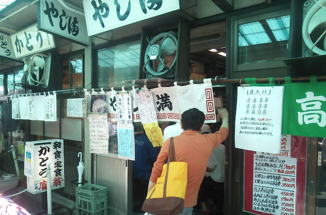 場内市場は、あたりまえだが「市場」であるので始まりも終わりも早い。ボクらはいつもよりは早い11時半に集まったのだが、それでも飲食店はすでに仕舞い支度に入っていた。悠長に選んでいる暇などはないので、マグロ隊員オススメの中華店「やじ満(ま)」に全員で入る。カウンターしかない人気店なので、先にマグロ隊員が空いた席に着いた。しばらく待つと、3つ空いたので、残るボクらも座ることができた。