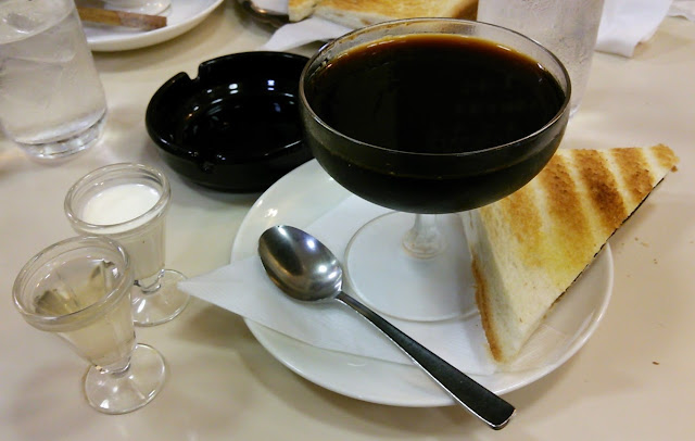 「6人なんですが、入れますか?」と問うと、年配のご主人が席を空けてくれた。ソファに腰をおろし、「やれやれ」と。ボクはその日のサービスメニューだったコーヒーゼリー(480円)、ラーメンだけだと足りない、という田中隊員はコーヒーとのりトースト。一切れ分けてくれたのでありがたく頂戴す。初めて食べたが、パンの厚みとバターの塩気、海苔の風味がベストマッチで旨し。