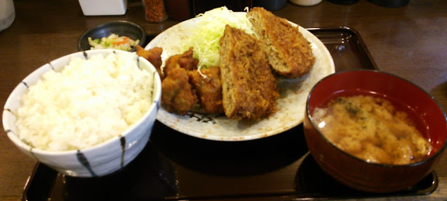 オーダーは「メンチカツ&とり唐」の定食(750円)。ご飯は、ランチタイムは大盛り無料だという。当然頼む。揚げたてのメンチカツはやっぱりいいねえ。肉汁はホドホドだが、無駄にダラダラしたたるのよりはこっちのほうがいい。みっちり肉が詰まってるぜ!