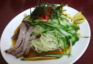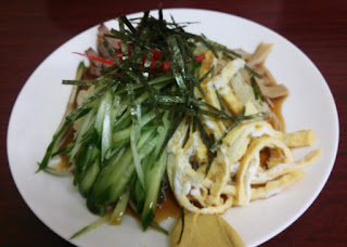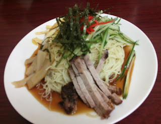 ボクは「冷やし中華」(950円)、田中隊員は「ラーメン」(650円)をオーダー。ラーメンは「正しい東京ラーメン」という感じで、見るからにアッサリ。ボクの冷やし中華は、富士山型に盛られた麺の山肌に様々な具が載せられた立体構造。正面から見ると不可視な側があるので、回転させながら撮影してみました。ヒヤチューの顔はひとつじゃないぜ! シナチクたっぷりなのが珍しい。チャーシューはしょっぱめでした。