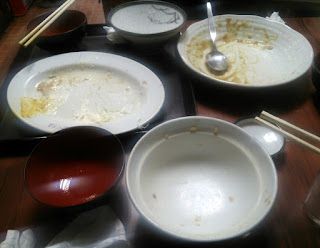 さっき覗いた時には誰もお客がいなかったのでタカをくくって行ったら、予想に反して満席。仕方なくボクらはバラけてサラリーマン客と相席。ここは静かな店で、最初に中西隊員が扉を開けて「2人なんですけど」と言ってもホールを仕切る老女将(というかフツーのおばあちゃん)はノーリアクションでややビビった。