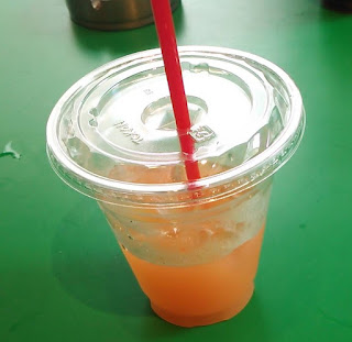 行ってみると、店前のテラス席でトロ隊長がタバコを吸っていた。店内に入ってドリンクをオーダー。こちらはセルフサービスが基本の店で、そのぶん値段が安い。なんとコーヒーはカップだけ受け取り自分で注ぐのである。ボクは「グァバジュース」のMサイズ(230円)をオーダー。店内で飲んでいたらトロ隊長が「テラス席が空いたのでこっちへ来い」とハンドサインで知らせてきた。で、移動。