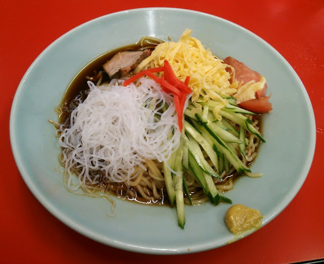 成光の冷やし中華は全体的に小ぶりで上品な感じ。キュウリ、トマト、チャーシュー、錦糸卵、紅ショウガなどの具材はオーソドックスだが、ハルサメが載ってるところが面白い。通の人から見ればさほど珍しくないのかも知れないが、ボクは初めて食ったよ。