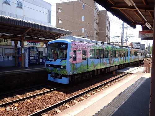 沿線には大学など学校も多く、若い人も多く乗車していてそこに観光客も加わるというなかなか活気のある路線。モミジを眺めやすいように作られた展望列車も走っている。