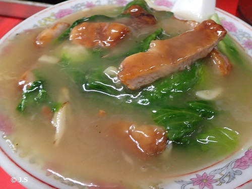 ご飯の上にニンニクと野菜を炒めものに入ったあんを揚げた豚肉にかけた「排骨飯」。味は京都という関西志向なのかやや薄め。東京であればかなり濃い味口で出されそうなものだが、さっぱりとした食感で食べられる。ニンニクの味がベースに台湾で食べた味を少し思い出した。
