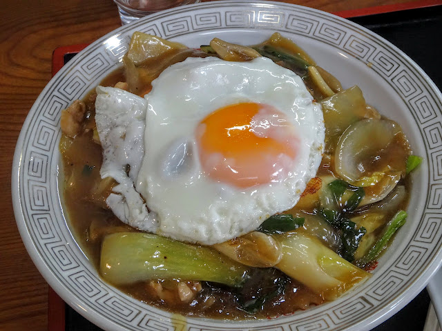 目玉焼きがのっとります。餡はお肉野菜たっぷり。少々酸味を感じますね。