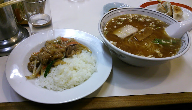 トロさんは風邪気味でもう歩きたくないと言うし、今日の探検エリアはかなり広範囲で店と店の間がずいぶん離れてるので、ボクもここにすることに決定。久々に複数での入店となった。マグロ隊員は名物だという「ミッキーライス」と「焼き餃子」。トロ隊長はサービスランチの「半中華丼+ラーメンセット」。ボクは「半生姜焼きライス+ラーメンセット」だが、ラーメンを味噌にしてもらった。