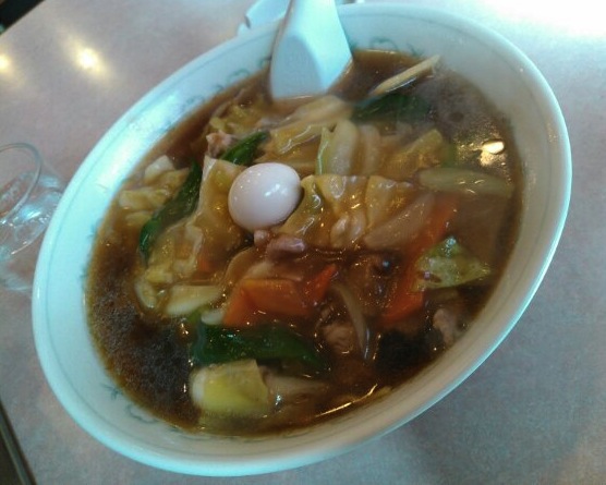 ミックスフライライスやハンバーグカレーなど洋食系も充実しているメニューから、広東麺ファンの私としてはやはり「うま煮そば」を注文。名前は違えど、広東麺と同じものですね。お客が私ひとりしかいなかったせいもあるのか、かなりスピーディーに出て来たうま煮そばは「これこそ正しい広東麺の鑑!」というビジュアル。真ん中にウズラの卵もトッピングされています。