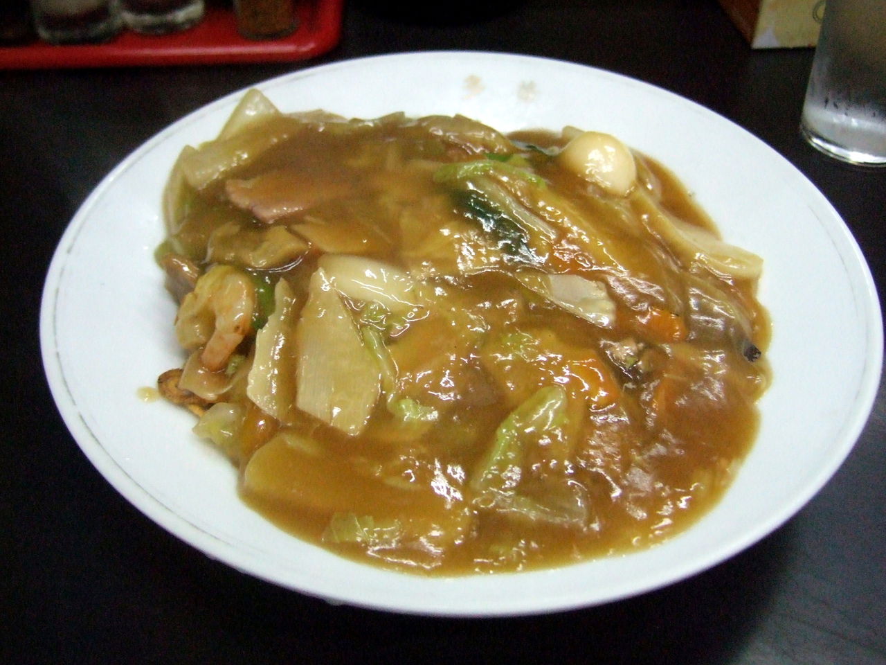 たっぷりの具があんかけになっていて、焼かれた中華麺の上にのっています。