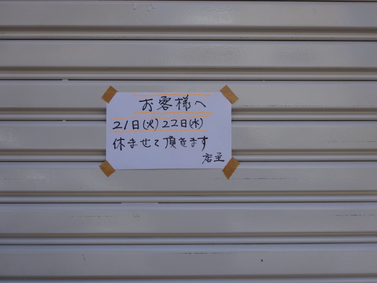 これはいい。でもシャッターが閉まっているし、張り紙があるぞ。