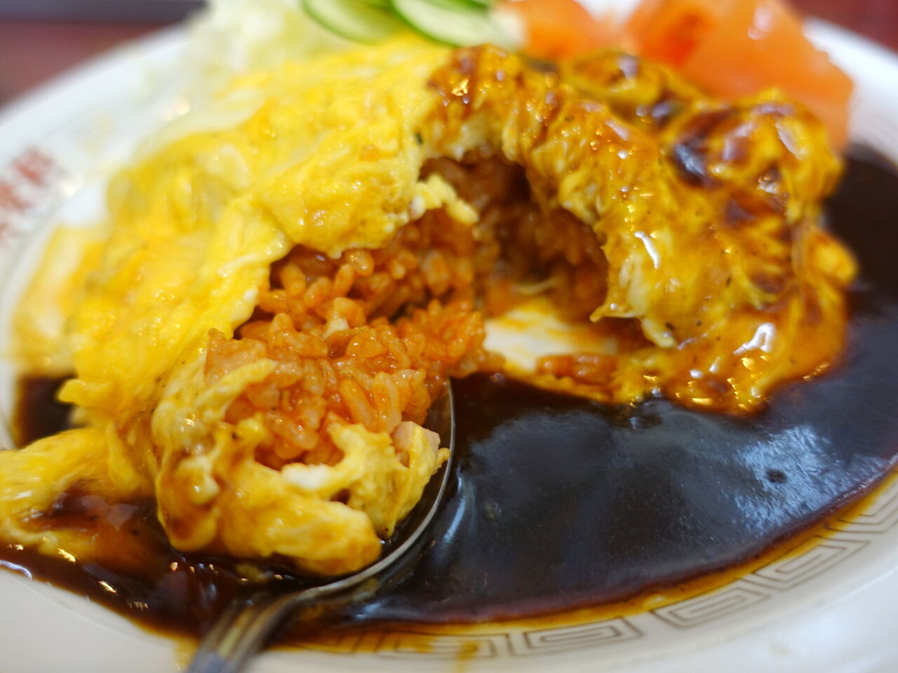 町中華のオムライスというと、こういうビジュアルではなく、堅焼き卵で巻いてあるオムライスですが、こちらはとろとろ卵をかぶせる系です。しかもね、トマトなんかついちゃっているわけですよ。キャベツの千切りなんかもいいっすねぇ。