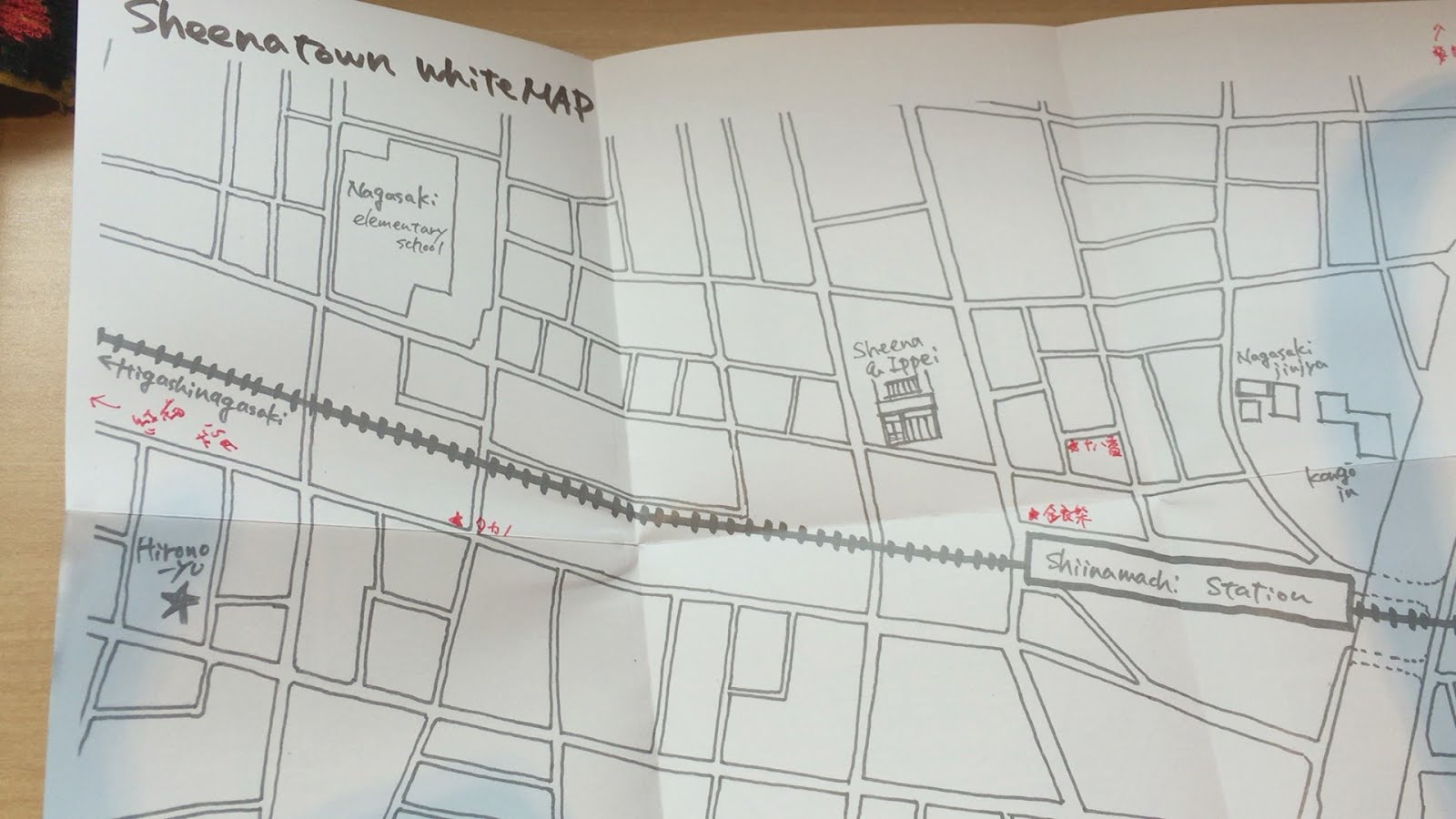 このパンフレットは裏が椎名町の白い地図になっていて、飲食店などを書き込みながら宿泊客たちにこの町を案内していると聞いていたので、使える!!って。