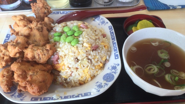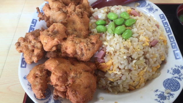 何を頼むかは迷うところだが豚の唐揚げ付きチャーハンに。豚の唐揚げはなかなかお目にかかれないがここのはフリッターのようなカリカリの衣に甘みがある。マヨネーズがとても合うのだ。写真で伝わるだろうか?チャーハンが少ないのではなく唐揚げが大きく多いのだ。体育会系の喜ぶ量。ふと見れば誰かの鳥唐チャーハンが。ケンタッキーフライドチキンのような唐揚げが二つ。でかい。