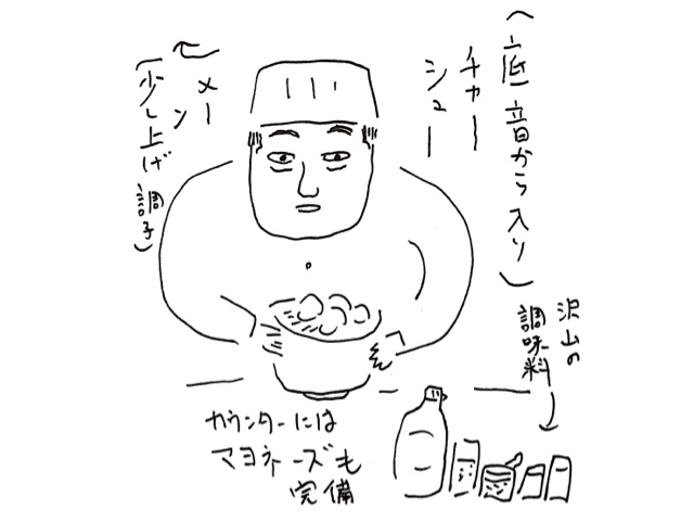 焼肉(豚)はしょうが、ケチャップ、味噌までありチャーハンは小、並、大、唐揚げ付き(豚か鳥)があったり、カウンターには調味料が沢山並びマヨネーズが席ごとに備えられている。マヨネーズはどの料理にも合い肉料理にかけたりする。生姜焼きにかけるのが王道。ティッシュペーパーがうず高く積まれていて絶対に切らさない。嬉しいのは全ての席に氷の入った水が用意されているところ。中華は水を飲む頻度が高い。随所に見られる独特の嬉しいサービス。