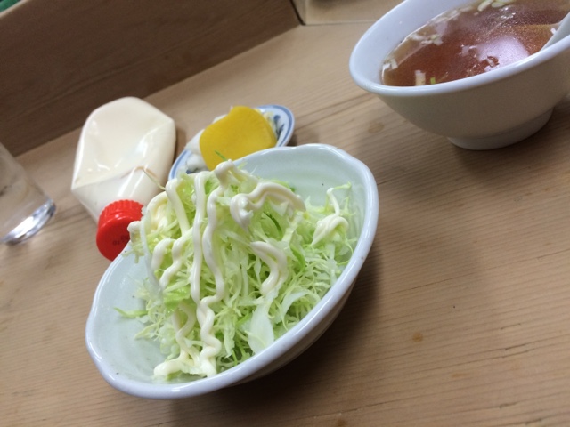続いて、オムライスの付け合わせとなるキャベツの千切りとスープ、つけものが到着。マヨネーズは皿にあらかじめ盛られているのではなく、マヨネーズ一本まるごと貸し出され、おのおの好きな量をモリモリするというシステムだ。これがなんだか嬉しい。